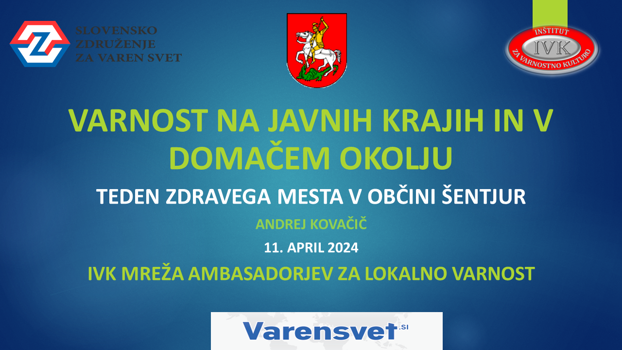 V Občini Šentjur so od 4. do 11. aprila 2024 potekale številne aktivnosti v sklopu že tradicionalnega Tedna zdravega mesta v Občini Šentjur. Letos je na dogodku sodeloval tudi IVK Inštitut za varnostno kulturo in sicer s predavanjem na temo VARNOST NA JAVNIH KRAJIH IN V DOMAČEM OKOLJU. Zdravje in varnost gresta z roko v roki, namreč več ko bo zdravih ljudi, ki ohranjajo svoje duševno zdravje, bolj varno bo naše okolje in skupnost.
